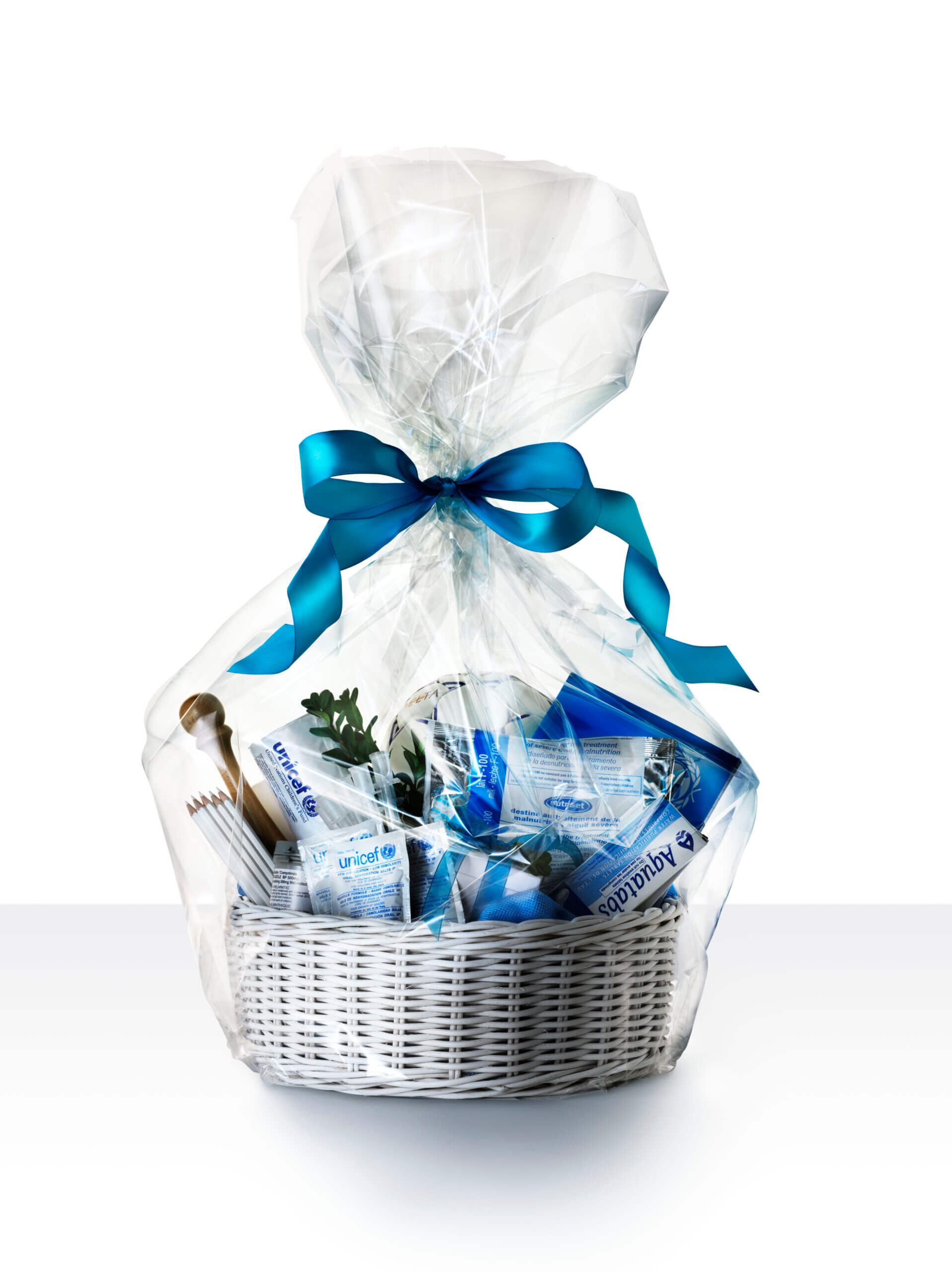 Þessi einstaka gjafakarfa inniheldur vítamínbætt jarðhnetumauk til að meðhöndla vannærð börn, bóluefni gegn mislingum, ormalyf og námsgögn.
