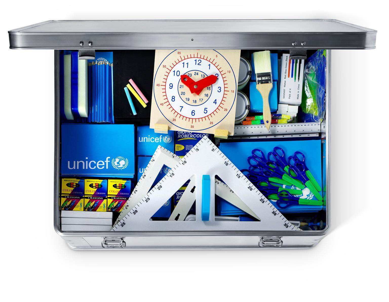 Málmboxið er fullt af námsgögnum: Stílabókum, blýöntum, strokleðrum, litum, skærum og öðru. Í því eru einnig sem dæmi upptrekkjanlegt útvarp og gráðubogi. Lokið á boxinu má síðan mála með krítum sem eru í kassanum og þar með eru börnin komin með krítartöflu.